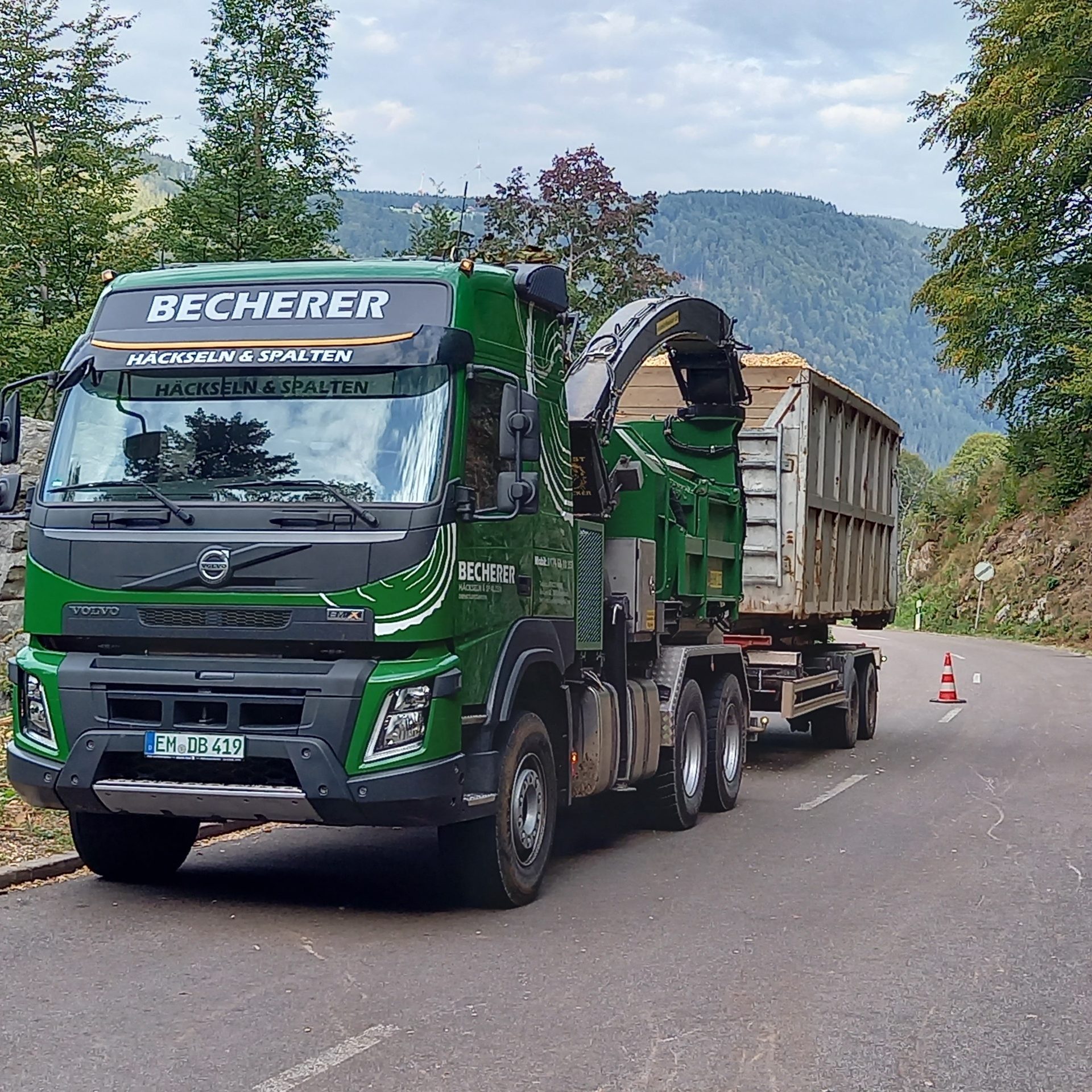 Die Hackmaschine ist ein BBHK-120 der Firma Wüst aufgebaut auf einem LKW der Marke Volvo FMX 540